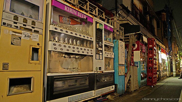 Here we see a row of unused battered vending machines.