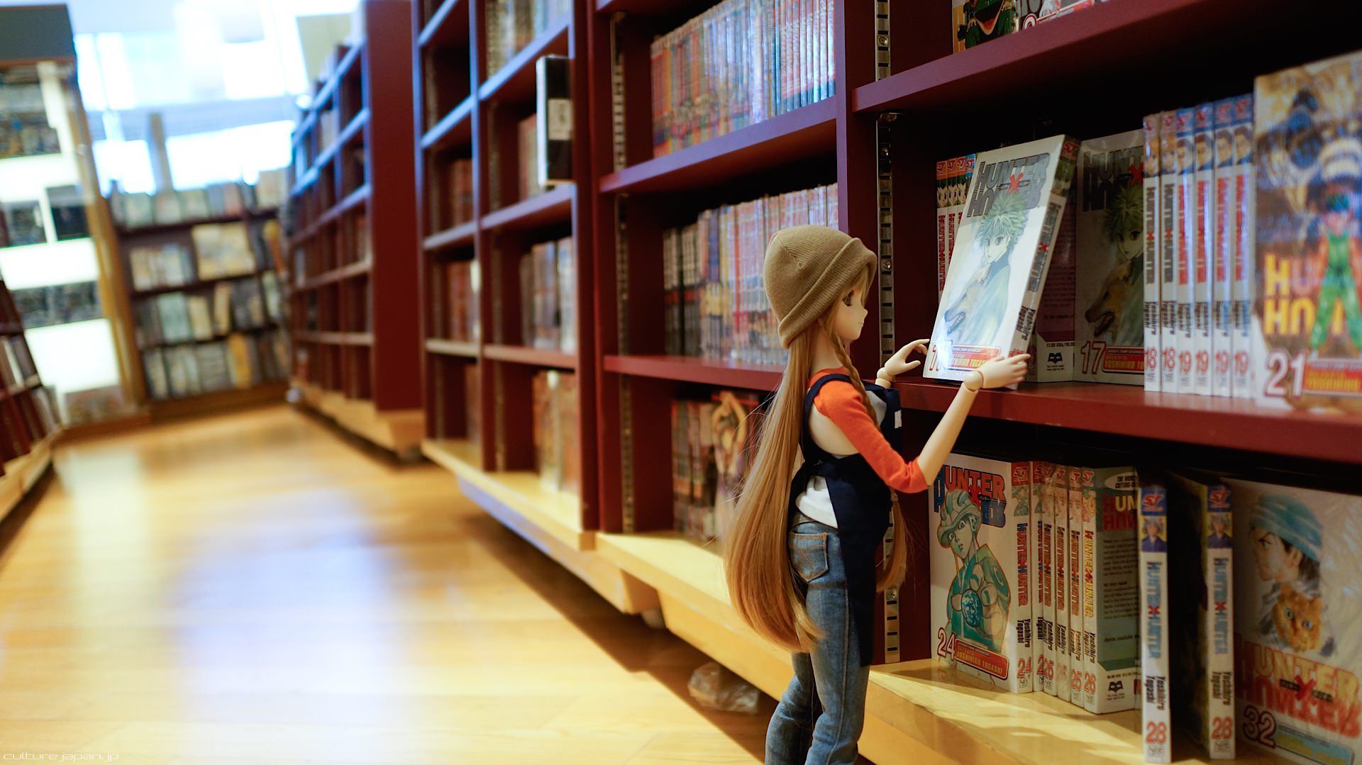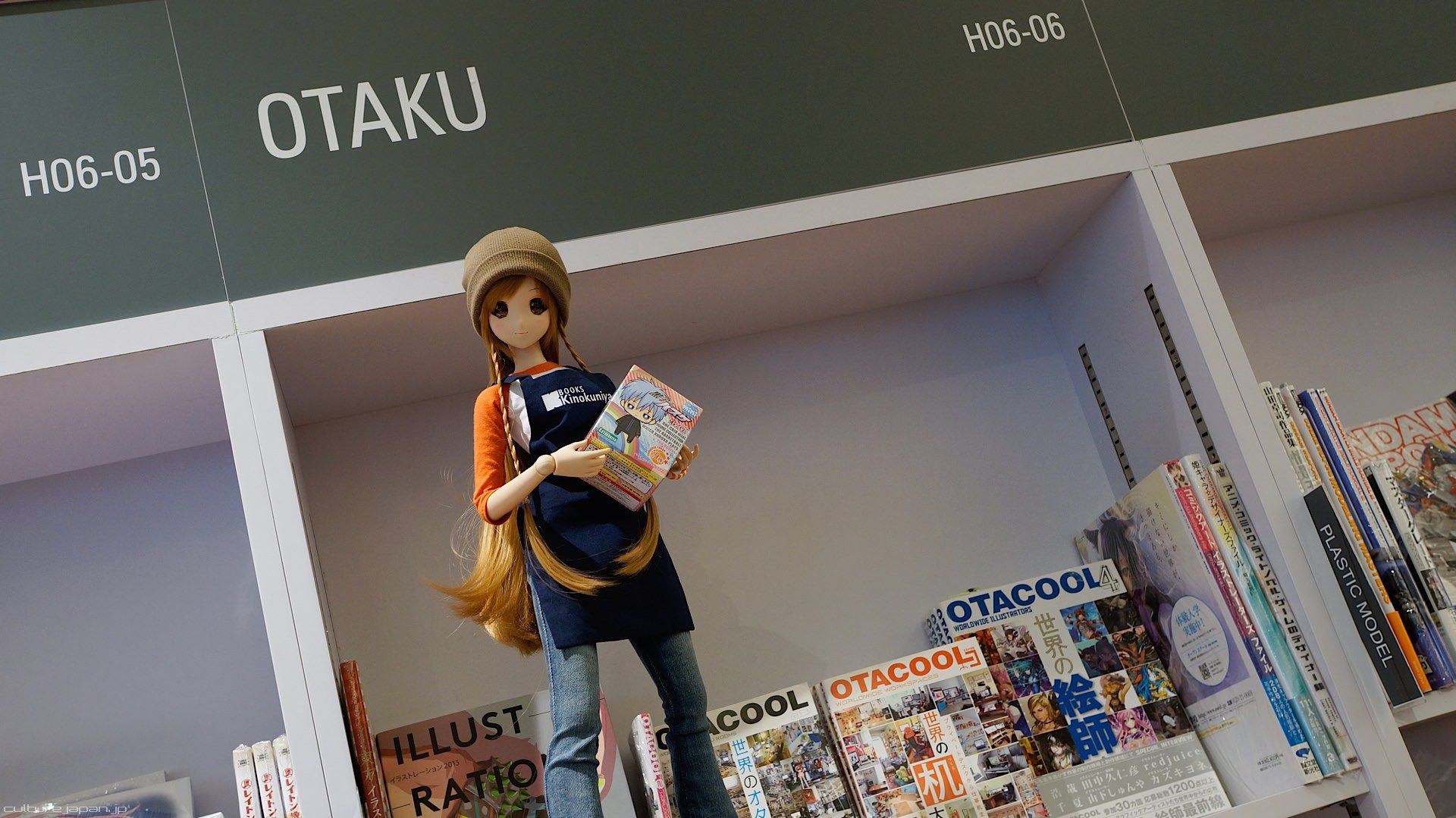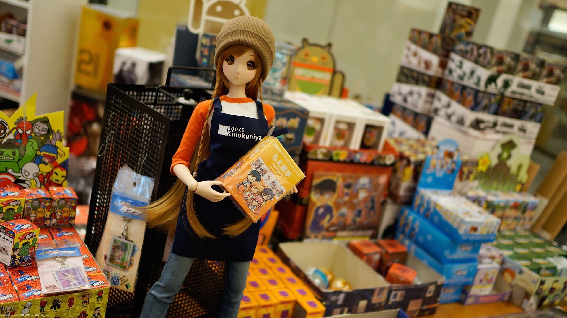 Our Mirai-chan just happens to work part time at Kinokuniya - here she is stacking the Japanese learning deck of cards Moekanji.