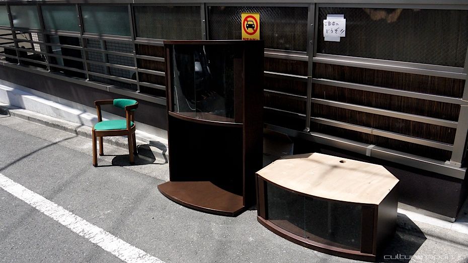 There is a small note on the wall asking folks to feel free to take these bits of furniture. Many folks would leave unwanted furniture and electrical equipment outside their house for a limited period. If nobody takes them then the owner would buy a sticker from the convenience store which basically pays the local ward to collect and dispose of the stuff.