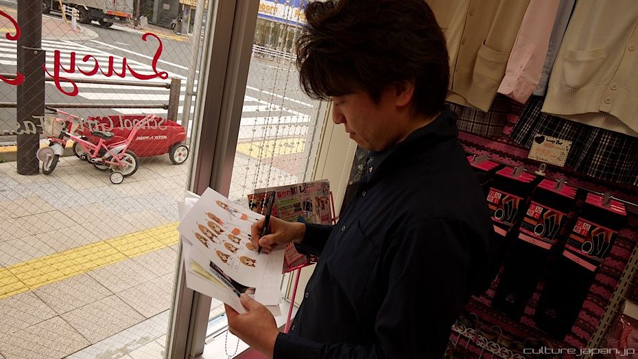 At the school girl uniform shop Lucy Pop. Kamiyama-san here is the owner and is currently designing the first line of Mirai-chan uniforms starting with the Summer version. Should be ready in June for filming and for retail late Summer?