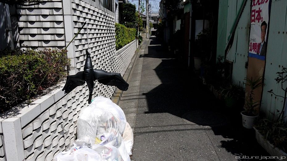 The black inflatable crow hung over some rubbish to scare other crows as this one is supposed to be dead ^^;