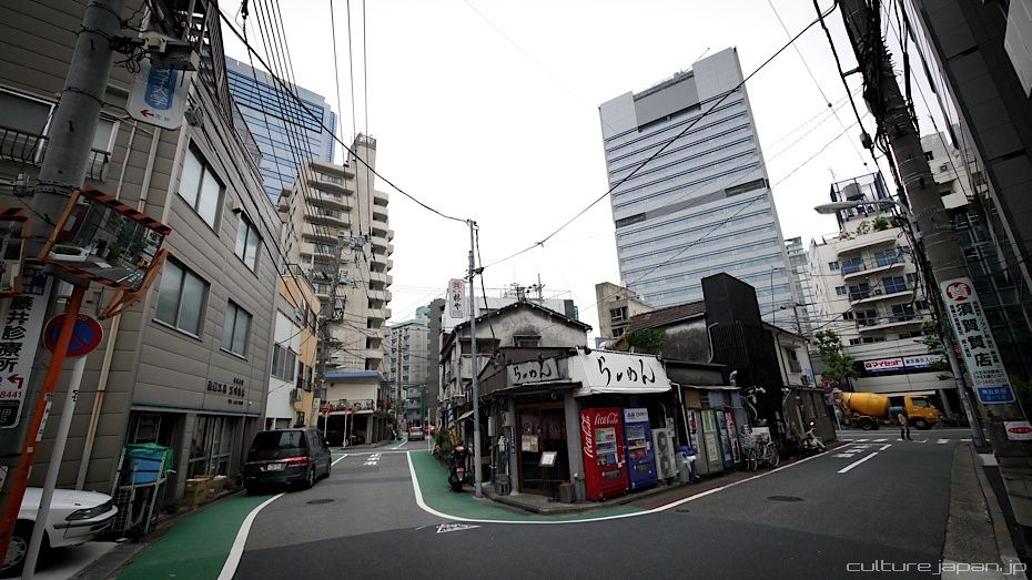 Somewhere on the back streets of Gotanda. Some old rubbing along with the new.