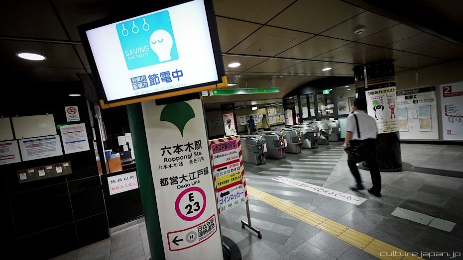 First photo - Roppongi station darker than usual. The sign with the smiley light bulb lets folks know that the station is running on reduced electricity consumption. The keyword here is "Setsuden" 節電] meaning "to conserve electricity." Ever since the Kanto Tohoku Earthquake, after the reactors went on the blink, folks in the East of Japan have been making efforts to reduce electricity consumption - most shops and restaurants will display a sign to this effect.