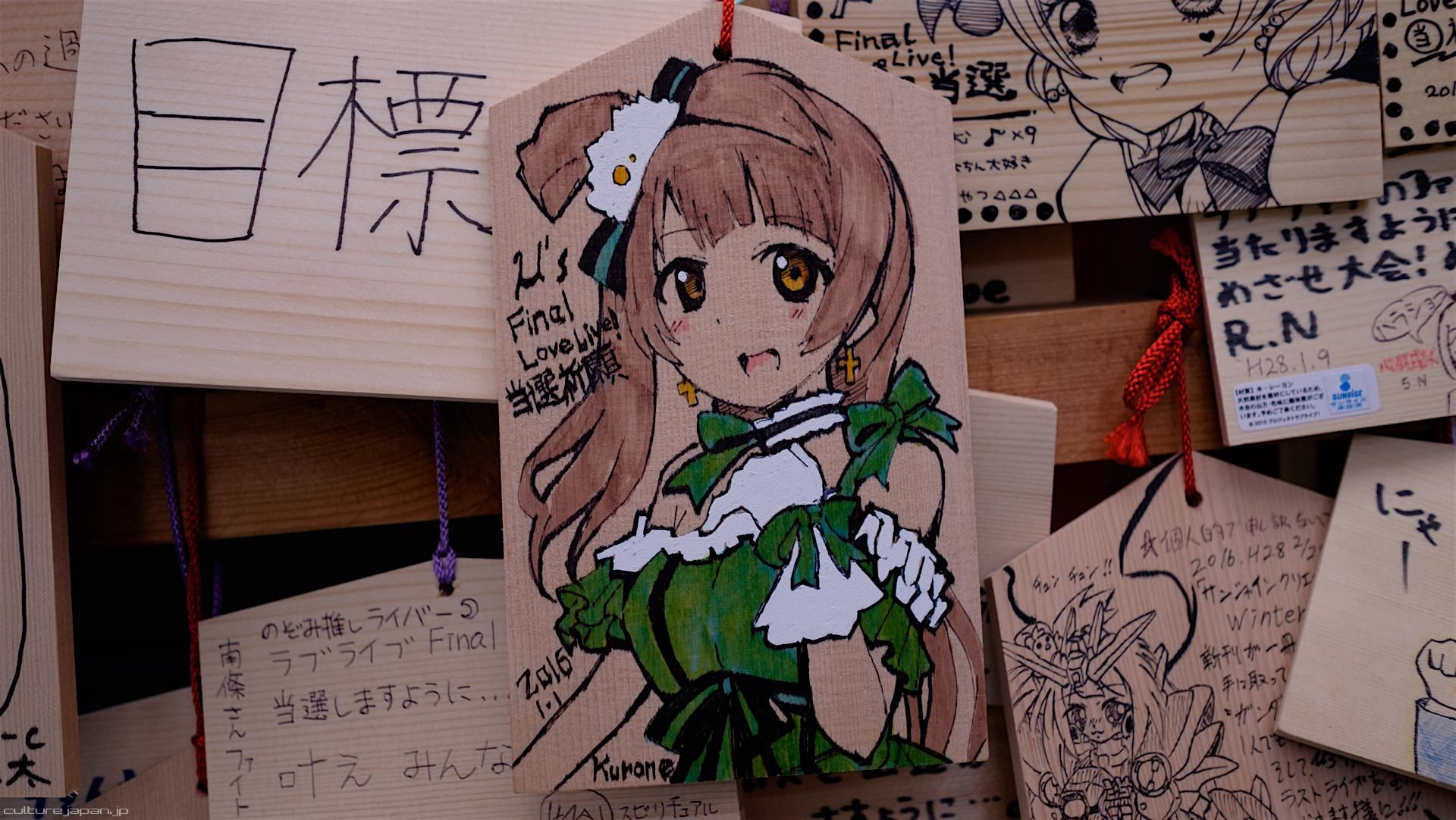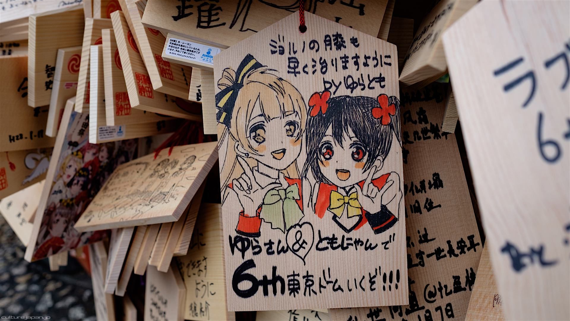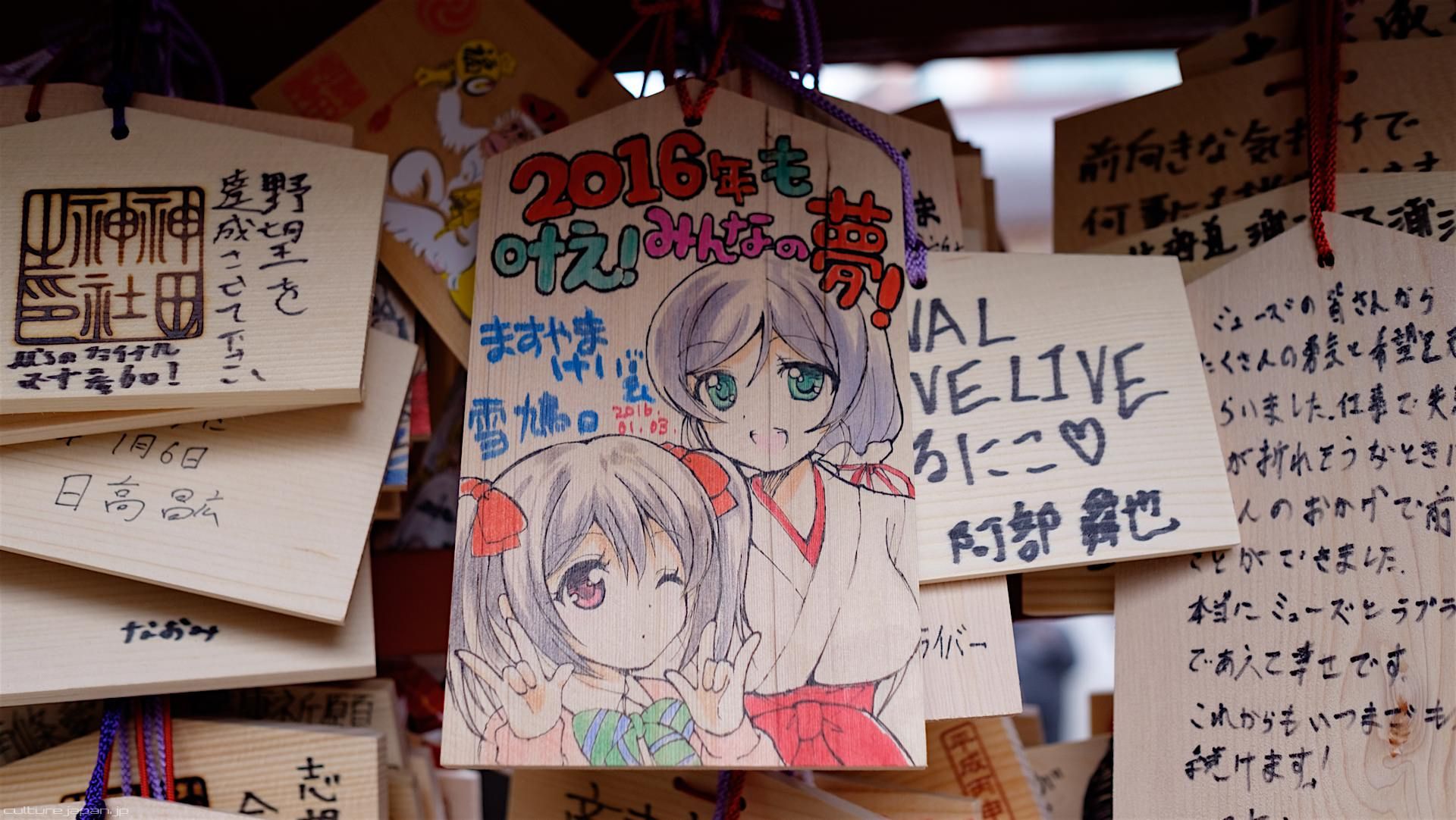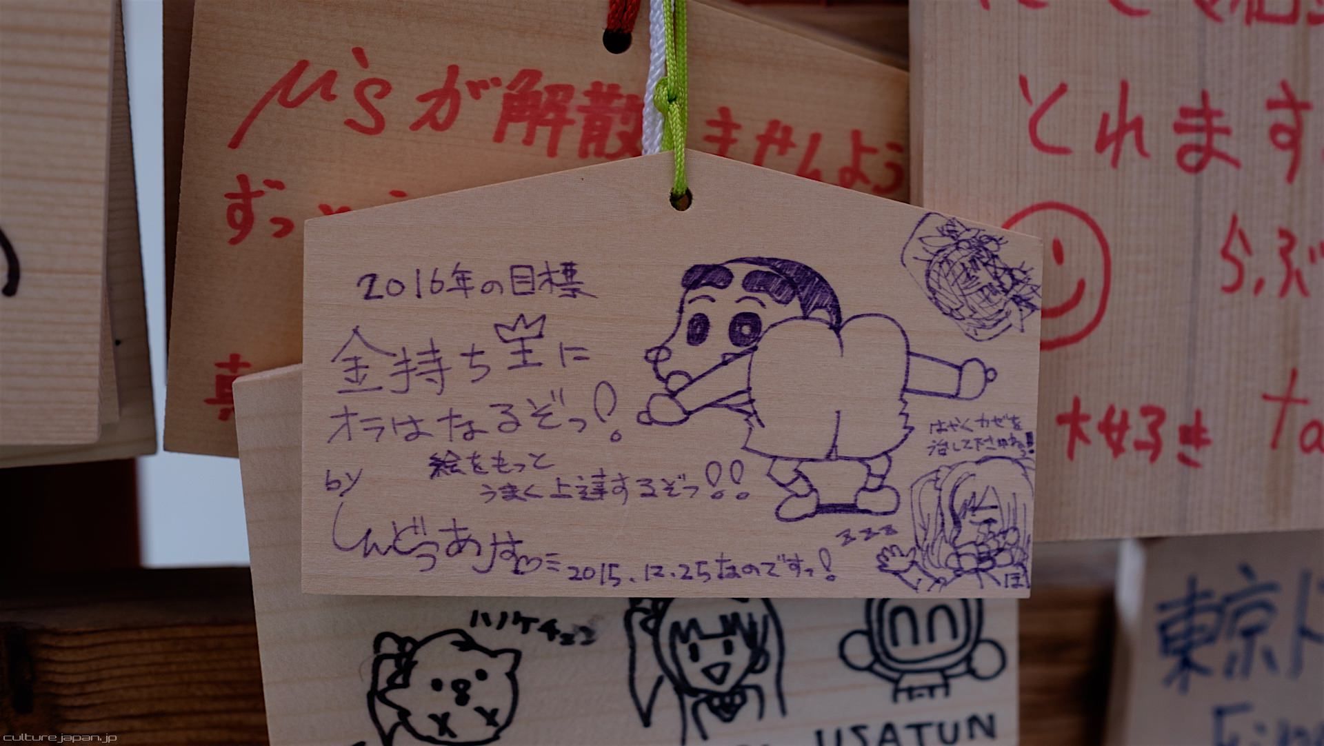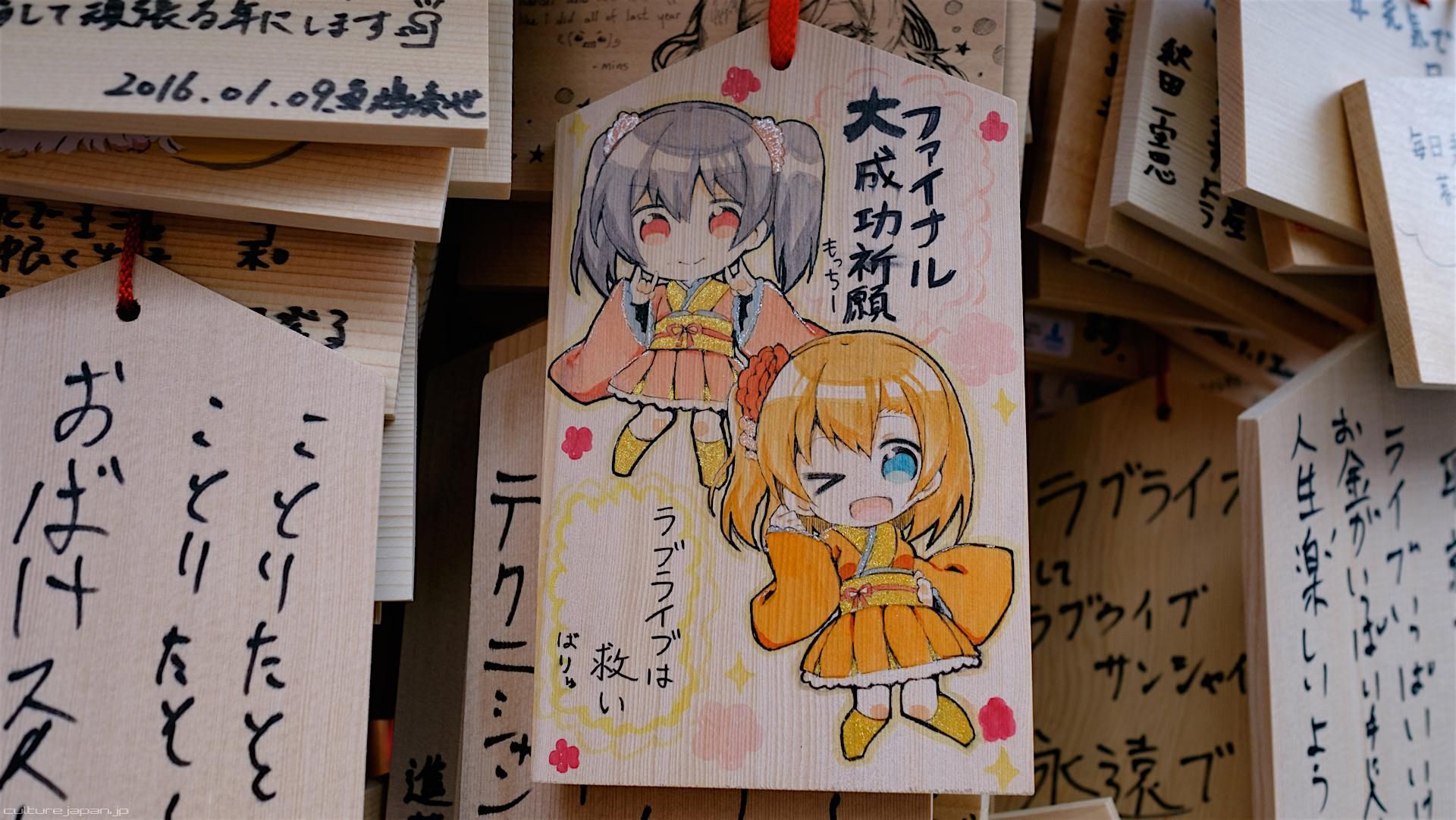 Kanda Myojin - for the past few years it has been the tradition of many otaku anime fans to draw their fave character on an Ema and hang it up in the shrine grounds together with a wish. These particular Ema are known as Ita-Ema .