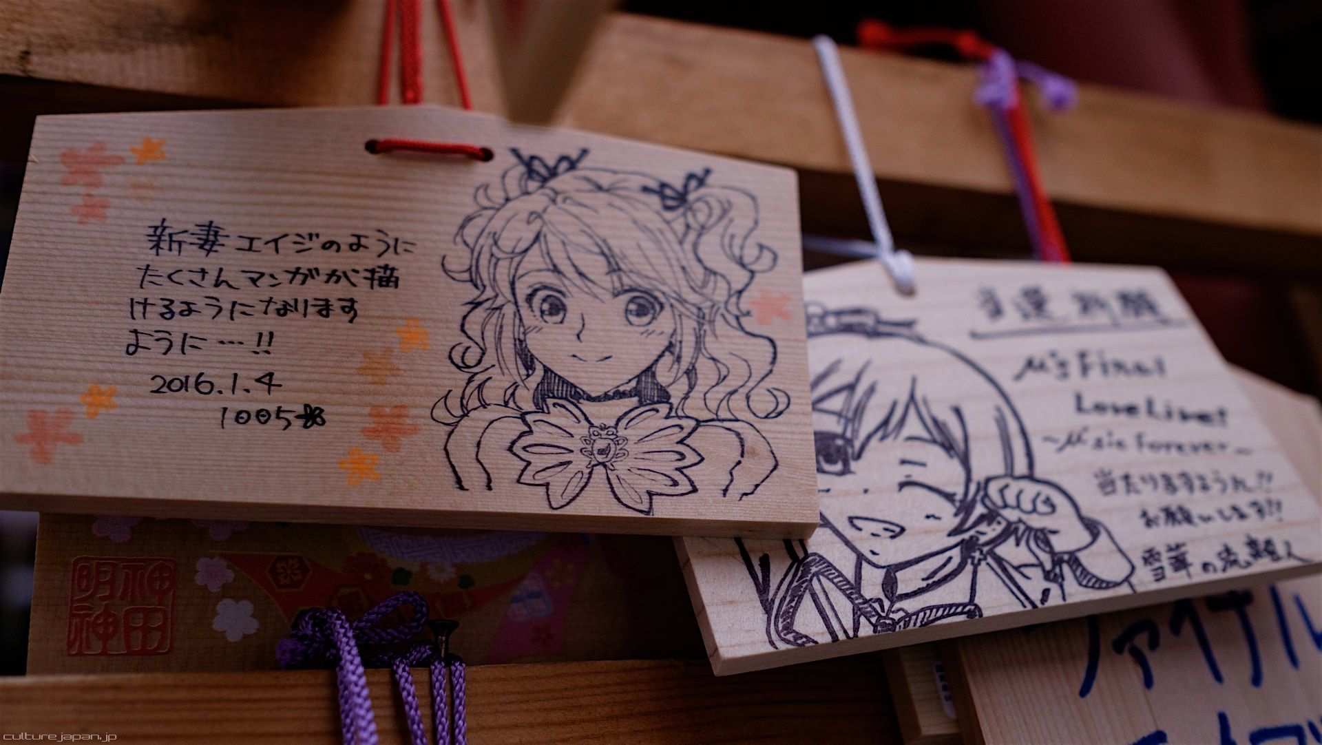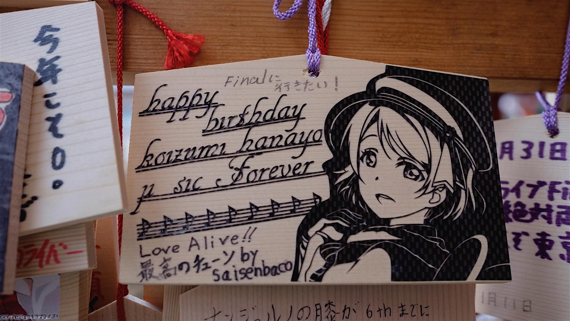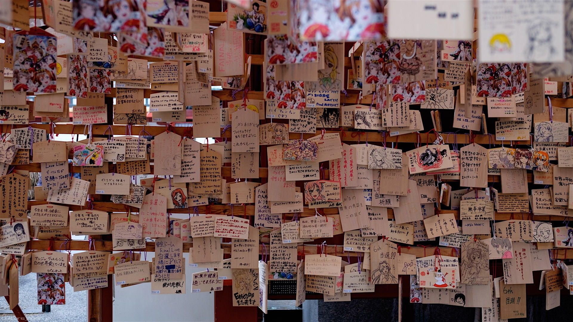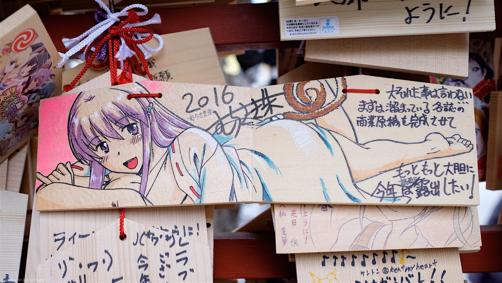 Kanda Myojin - for the past few years it has been the tradition of many otaku anime fans to draw their fave character on an Ema and hang it up in the shrine grounds together with a wish. These particular Ema are known as Ita-Ema .