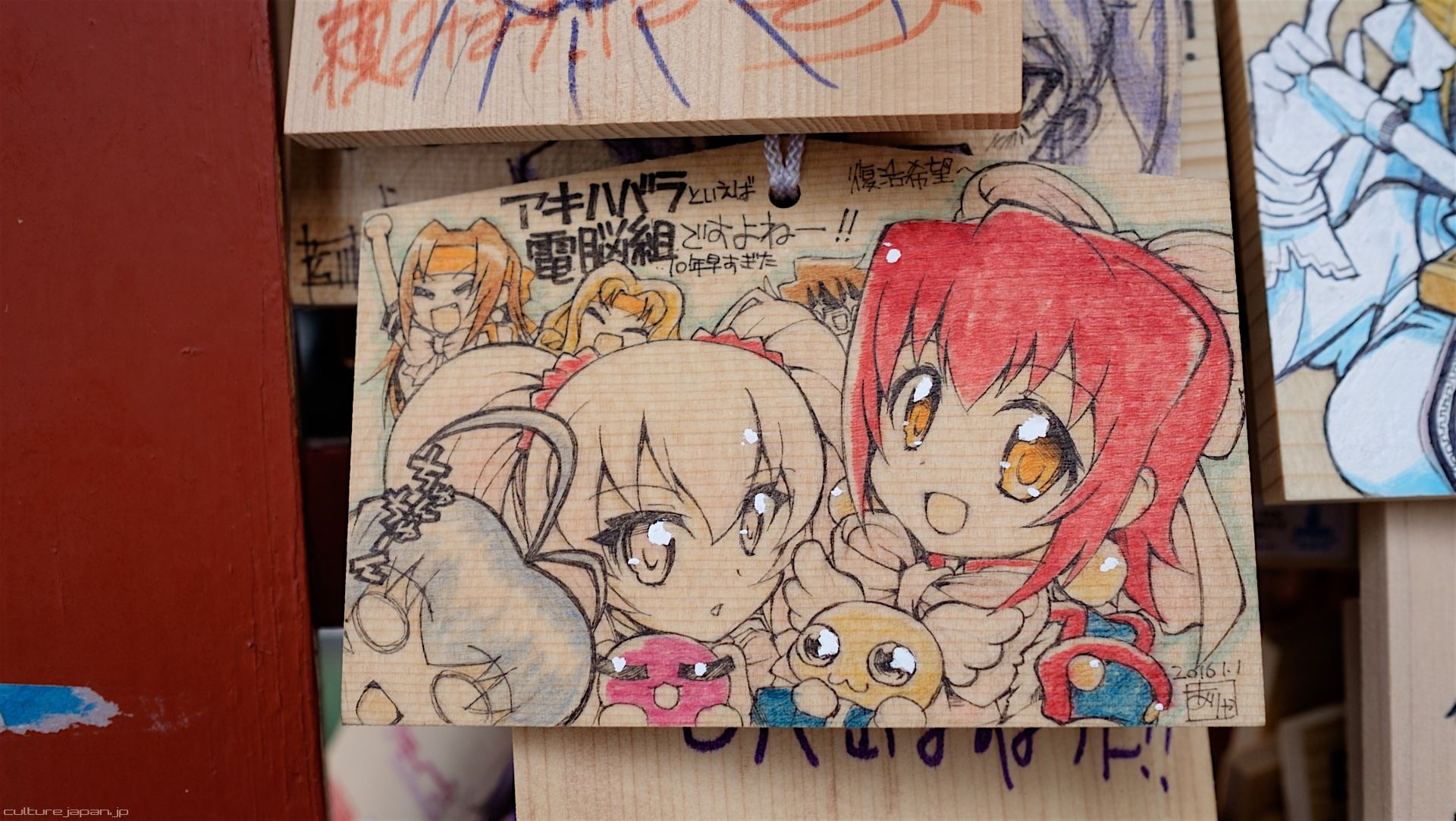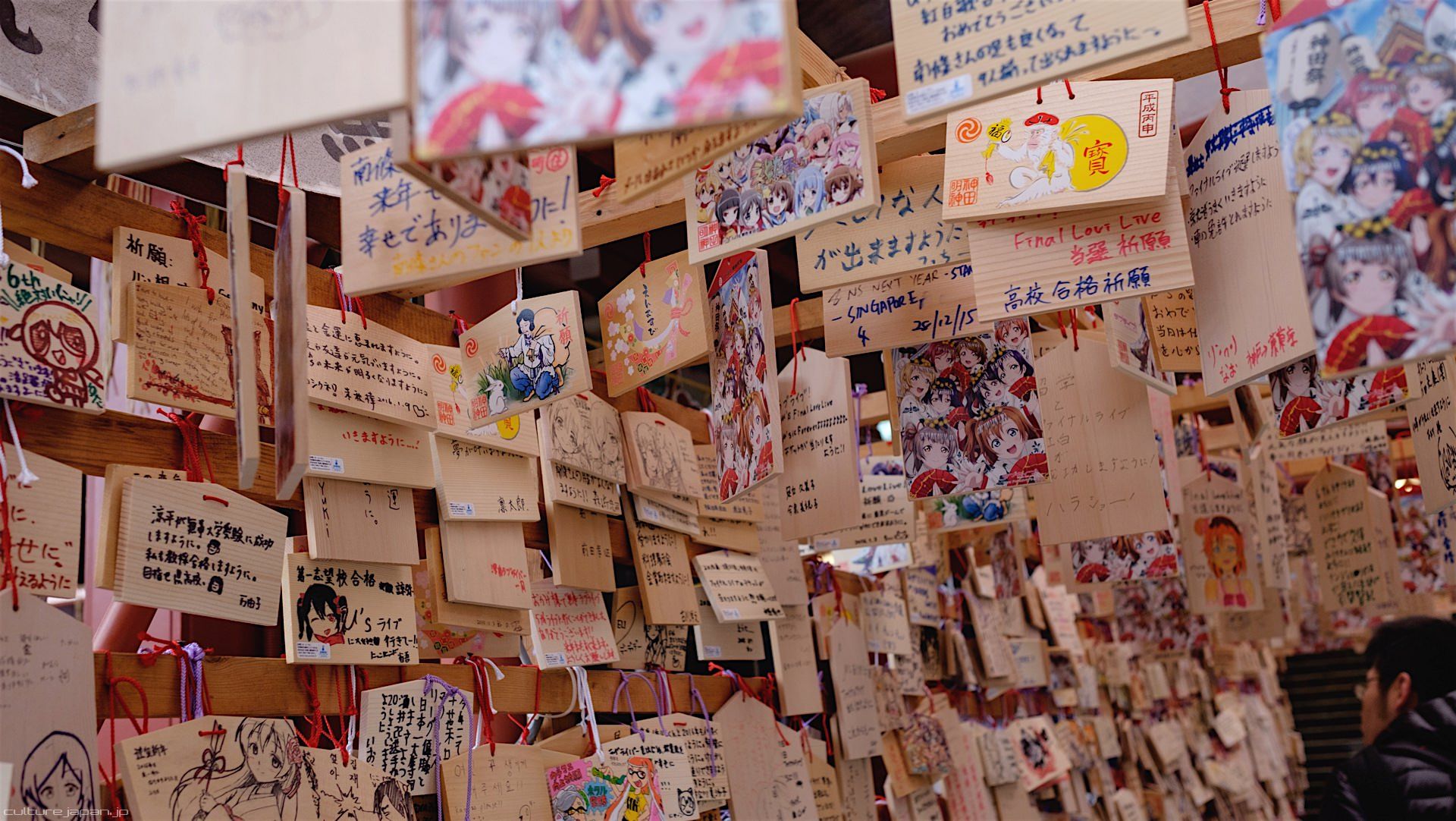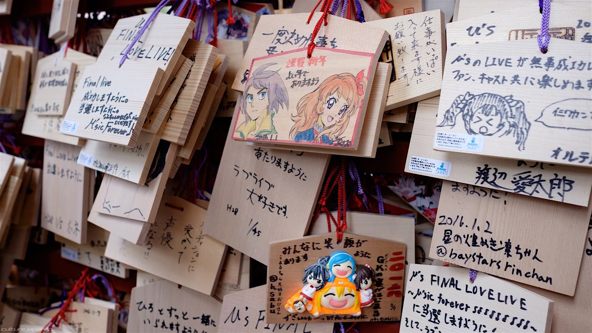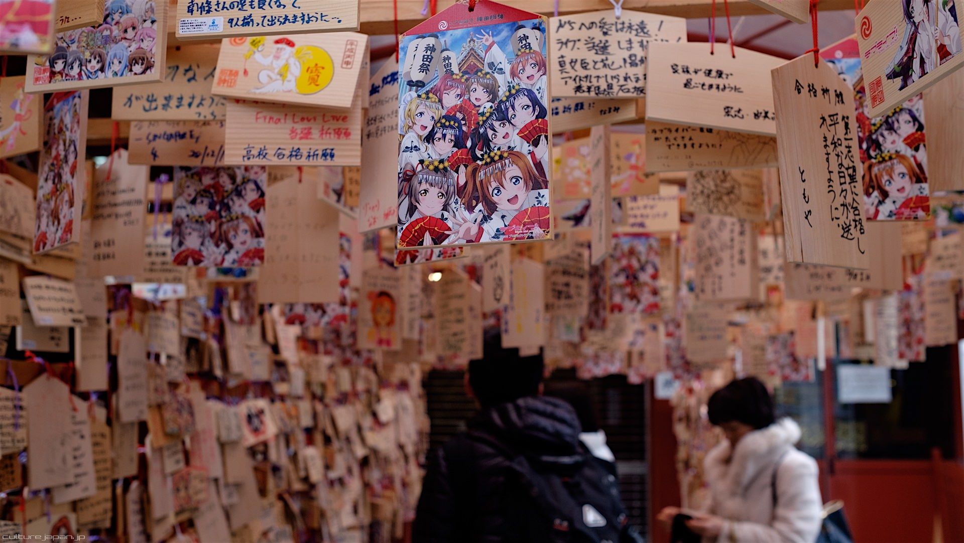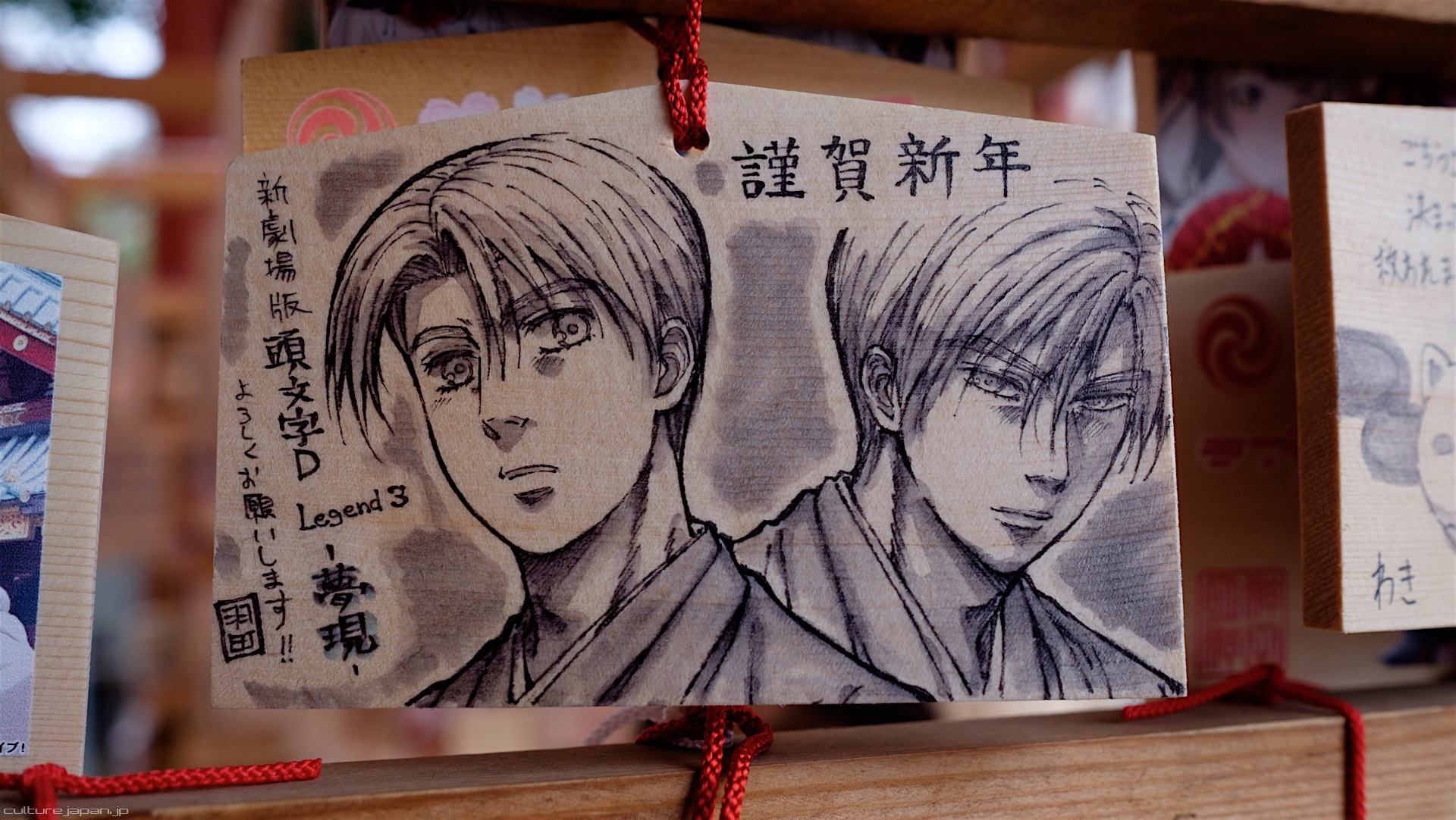 Kanda Myojin - for the past few years it has been the tradition of many otaku anime fans to draw their fave character on an Ema and hang it up in the shrine grounds together with a wish. These particular Ema are known as Ita-Ema .