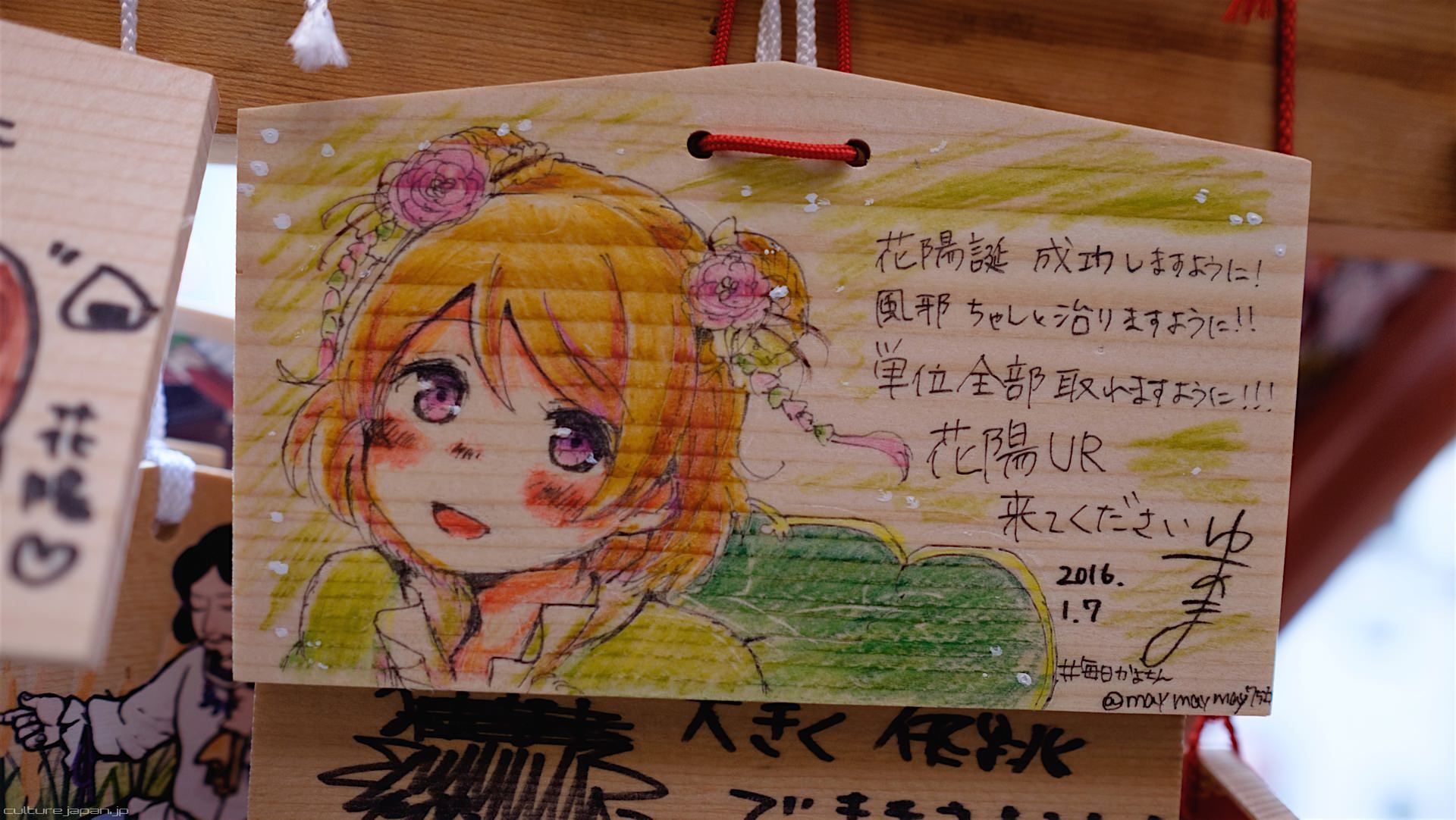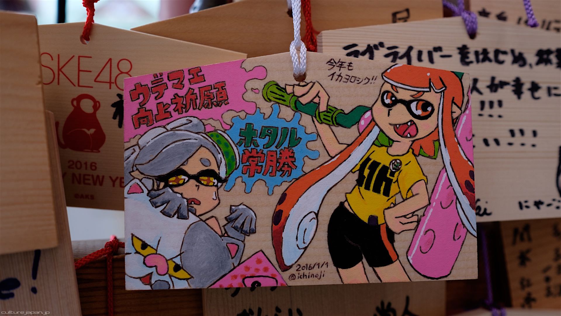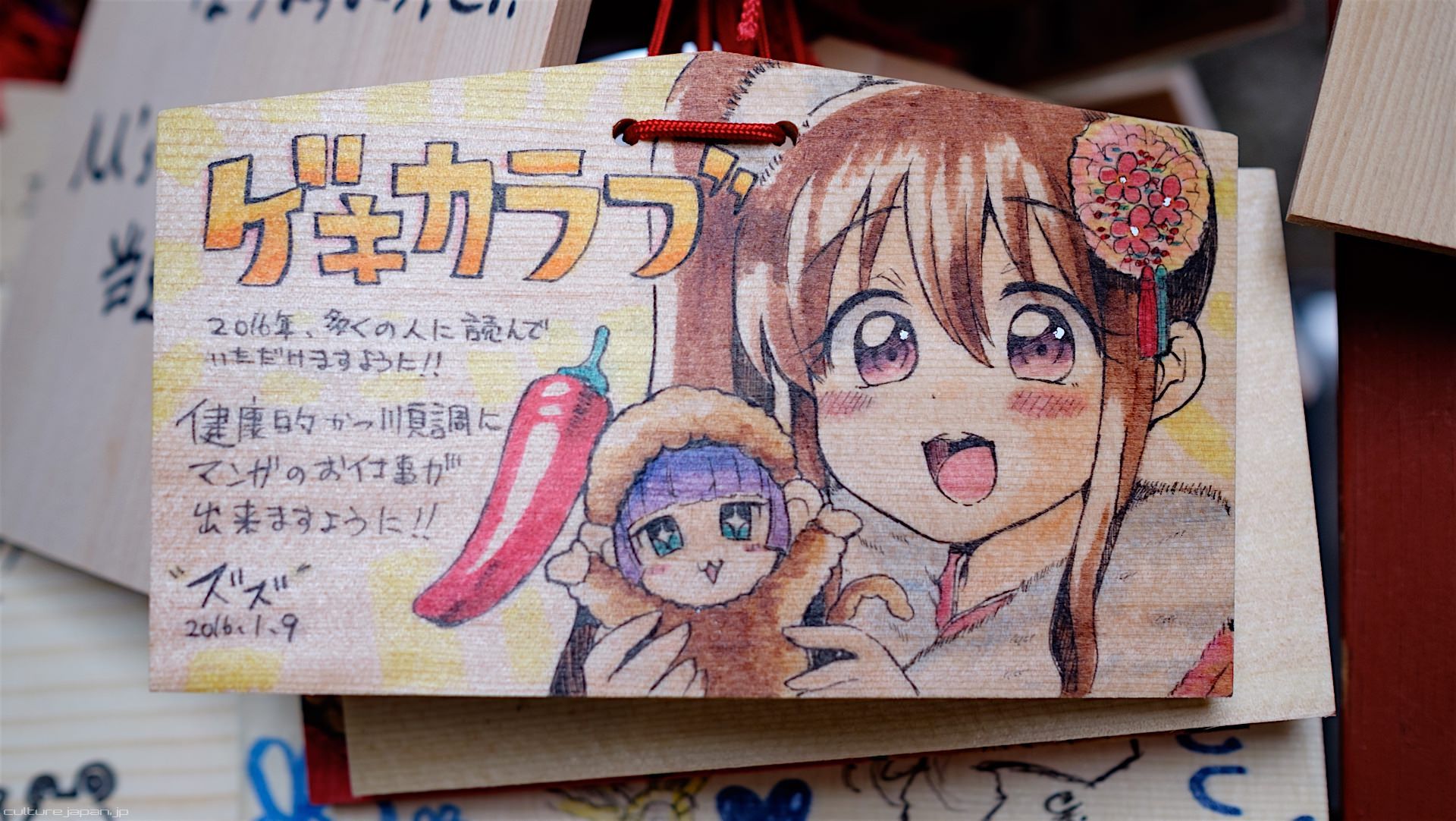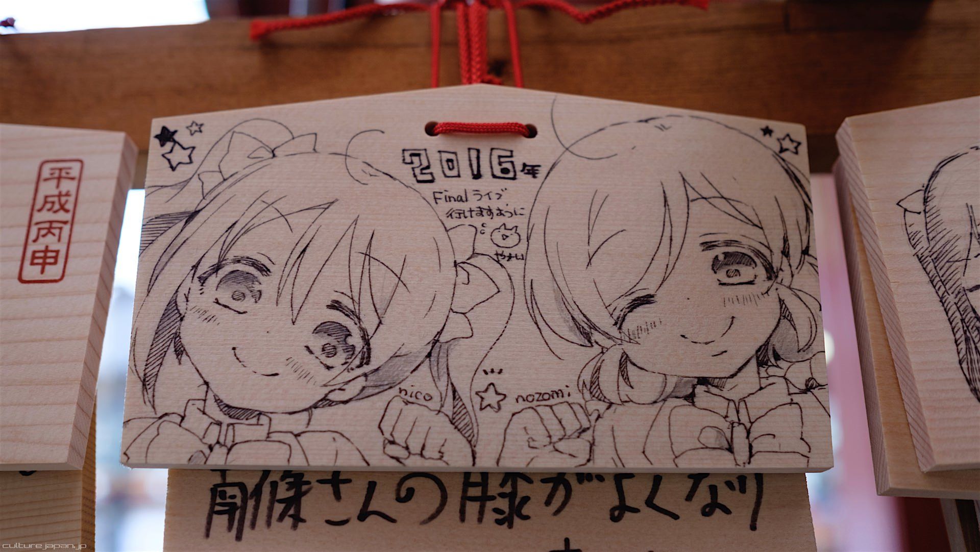 Kanda Myojin - for the past few years it has been the tradition of many otaku anime fans to draw their fave character on an Ema and hang it up in the shrine grounds together with a wish. These particular Ema are known as Ita-Ema .