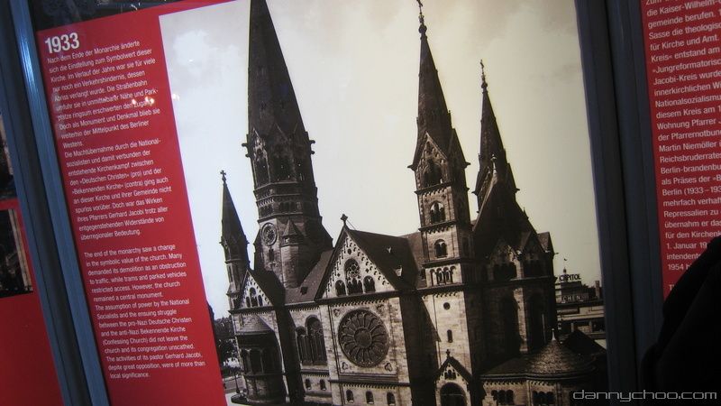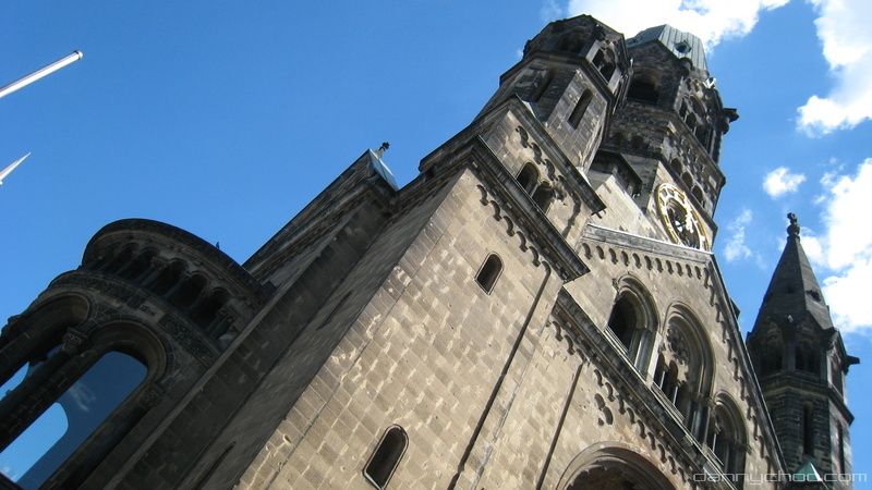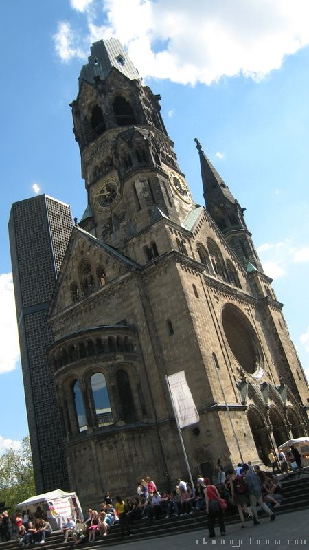 The Kaiser Wilhelm Memorial Church. The church has been left half destroyed as a reminder of the war.