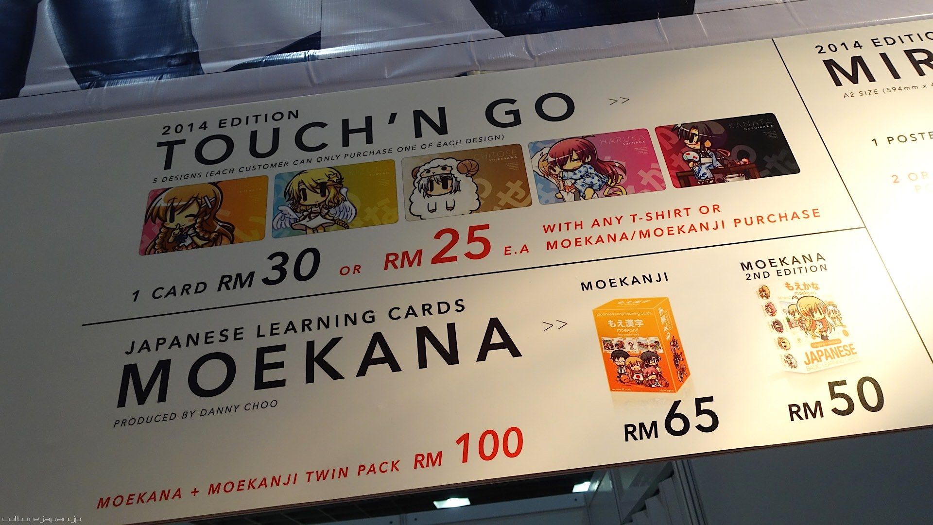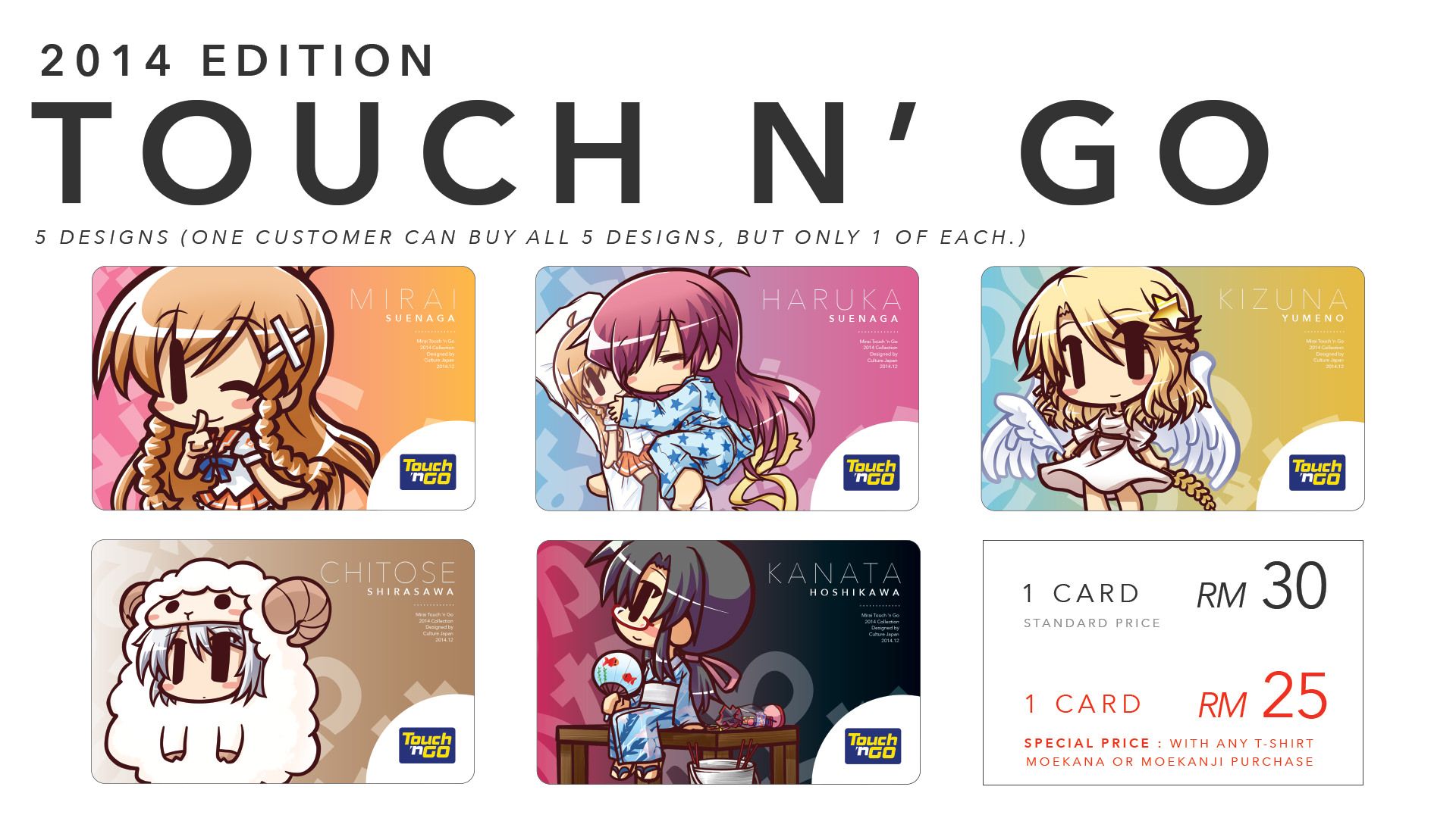 But to make it just a bit more affordable for our fans, we are going to sell them at RM25 each for folks who buy any one of our T-shirts or Japanese learning cards Moekana or Moekanji. The price of each Touch n Go without these purchases will be RM30.