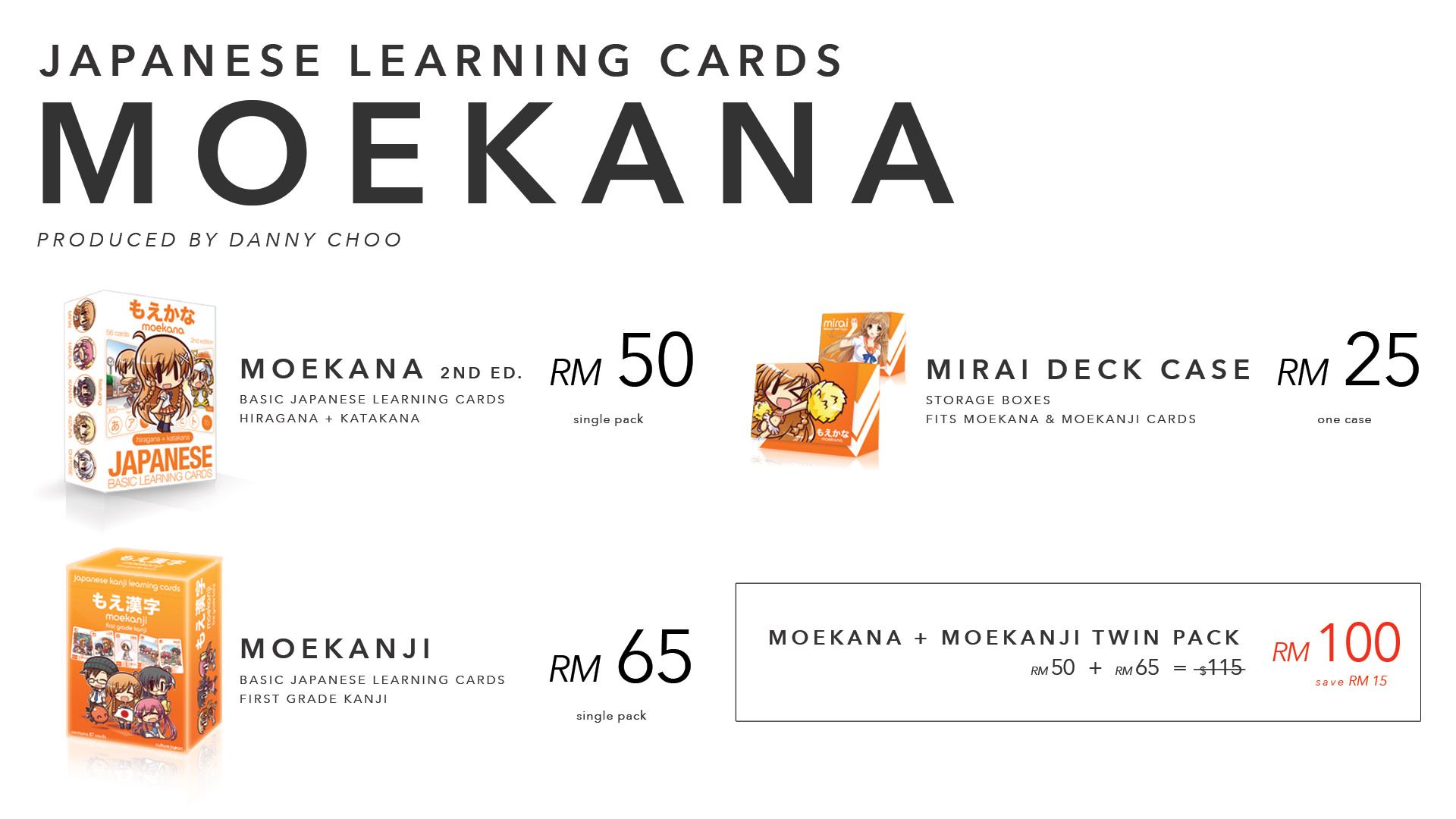 Moekana is RM50, Moekanji is RM65 or get both for RM100. The deck case to protect your deck of cards when a friend tries to puke on you costs RM25.