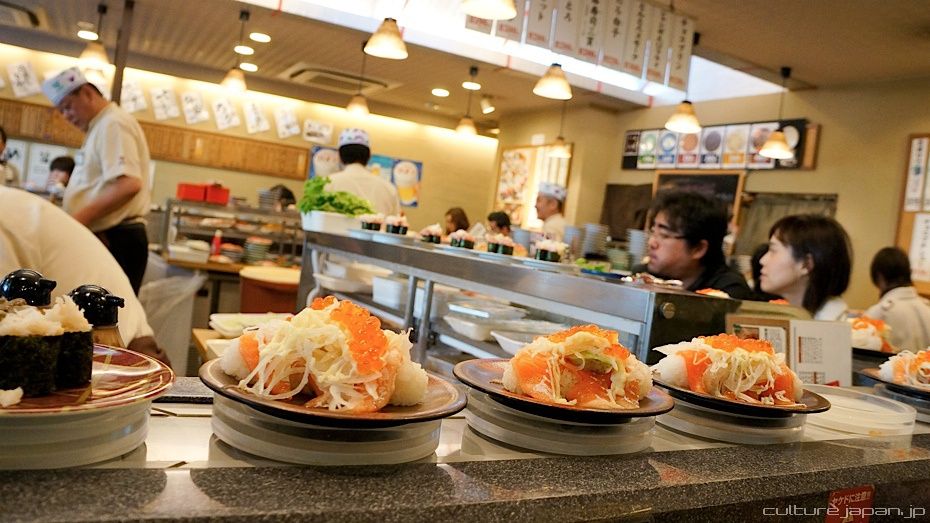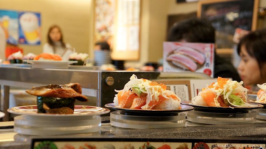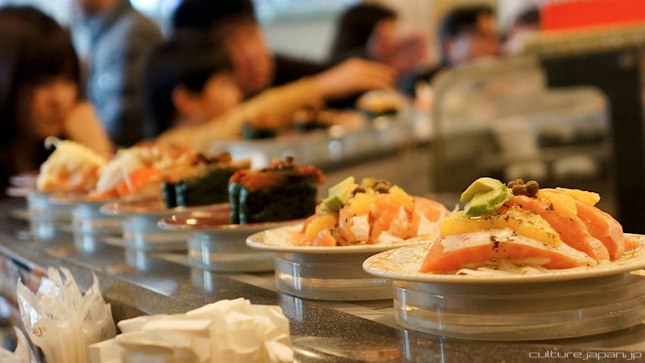 Conveyor Belt Sushi - also known as Kaiten Sushi ]. "Kaiten" means "to rotate" or "go round in a circle." As the name suggests, a load of sushi goes round on a conveyor belt and the customer takes what she wants for om noms.