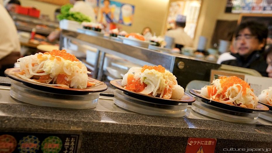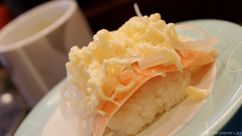 This kaiten sushi place has dishes which are not typical Japanese like these ones - a huge mound of rice topped with salmon, ikura and onions. Many gaijins come to this place which is why some of the dishes are more adventurous ^^;