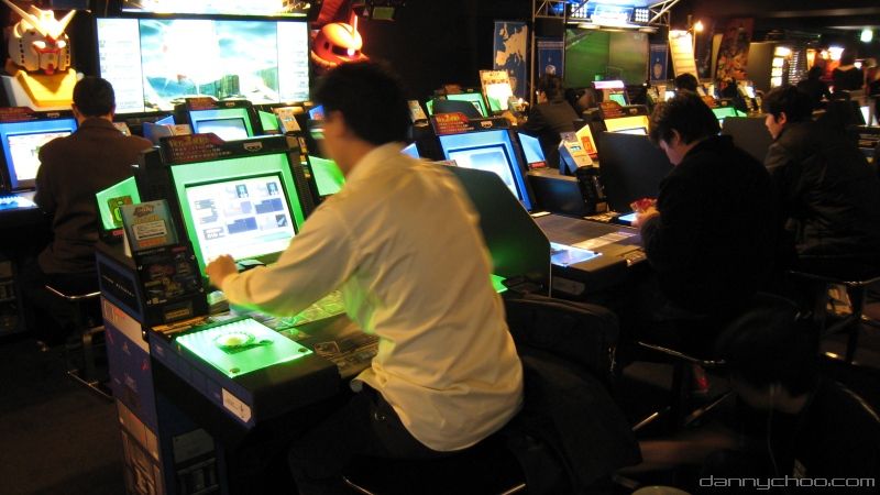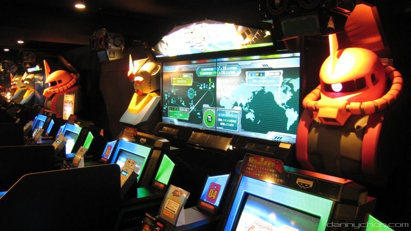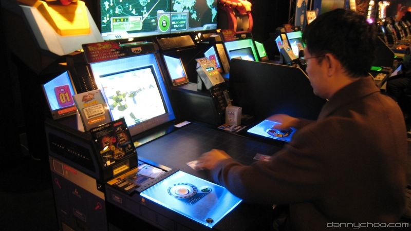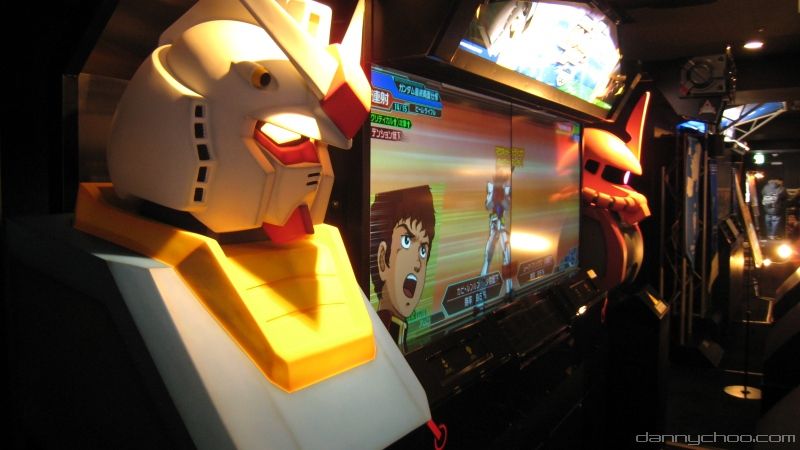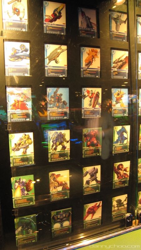 Located on the 7th floor in a Shibuya arcade, two sets of Gundam Card Builder machines took up half of the room - a set of machines consist of a huge screen so that by-standers could watch the battle and 8 machines where people sit at - pictures at the official site.