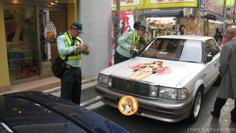 Now that civilians are in on the act, you see very otaku looking like folks dressed in these green uniforms carrying around with them a terminal and a digital camera. They need to take a picture of the offending vehicle in order for them to get their commission I guess. You see them squatting to take a picture of the car with a smug face.