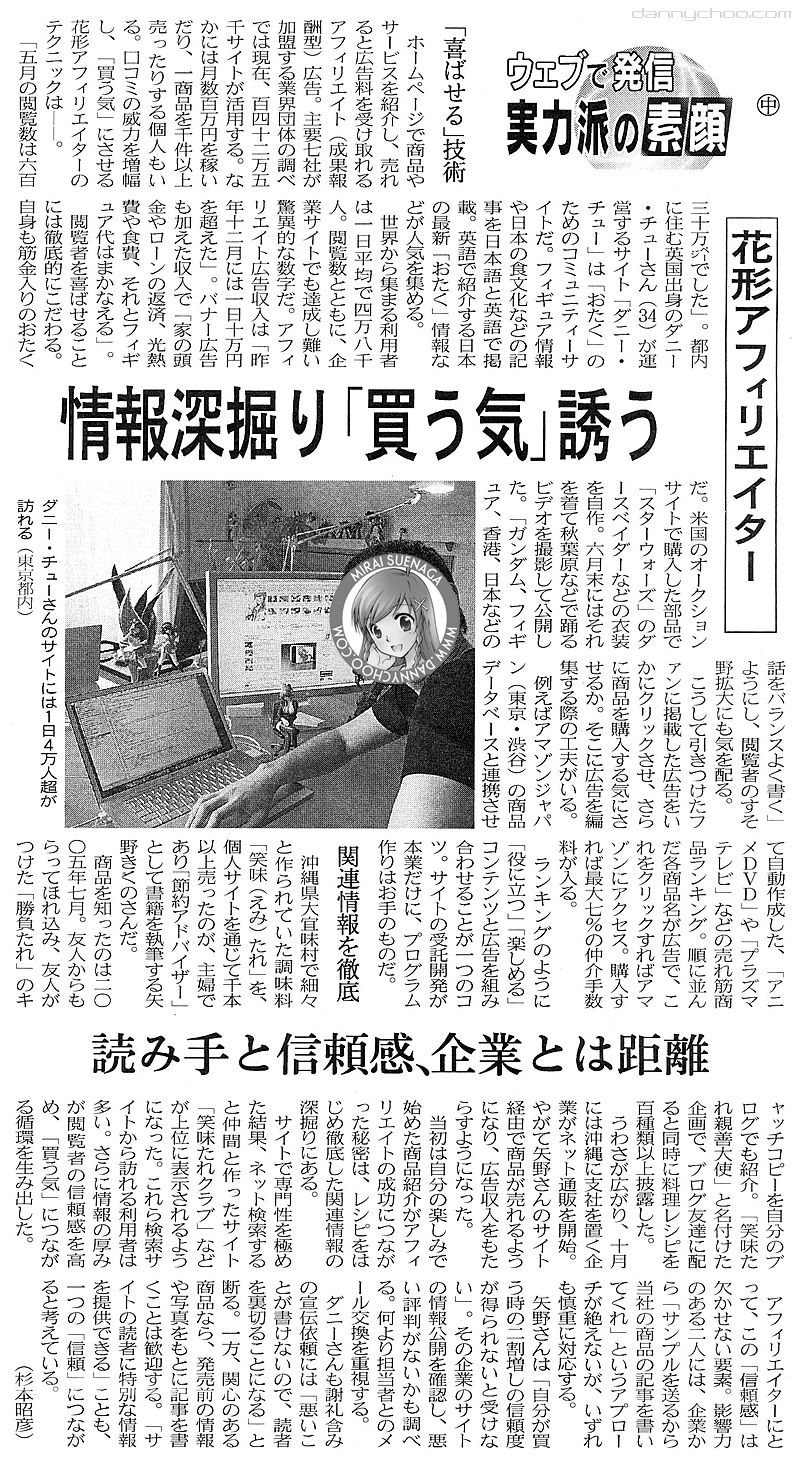 300 yen" type thing. Through these "pay to blog" services, many are starting to wonder about the legitimacy of info in blogs. In Japan, people have always had a tendency to rely on the information in blogs as it was a "human" writing their views as opposed to a corporate company flogging their goods.