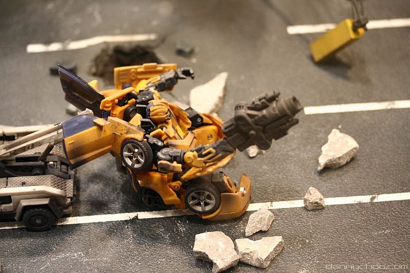 Bumblebee being dragged along in a diorama.