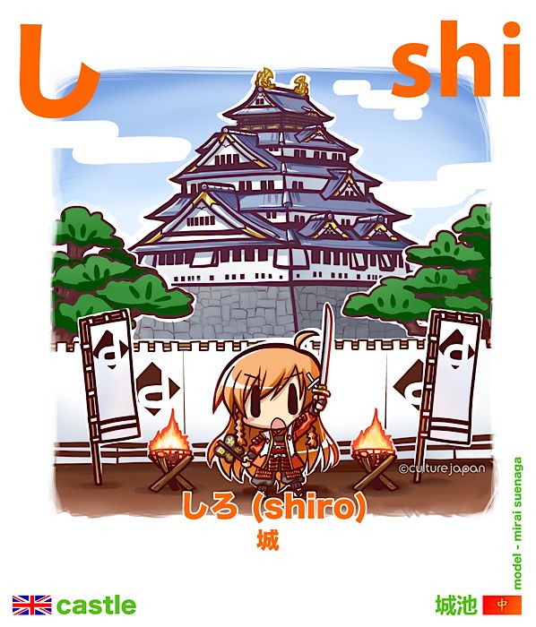Following on from the previous hiragana in this Moekana series which was さ, today we learn "し" (shi) which is pronounced "she". Today's word is "しろ” which means "castle".