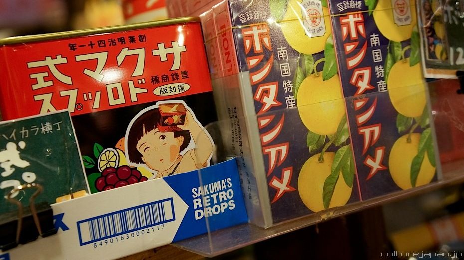Sakuma-shiki Drops with Setsuko from Grave of the Fireflies. In case you're wondering why the product name is written backwards - the majority of Japanese folks used to write from right to left but the style gradually went out of fashion after the second world war.