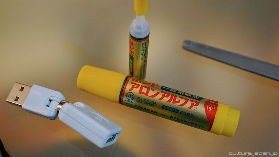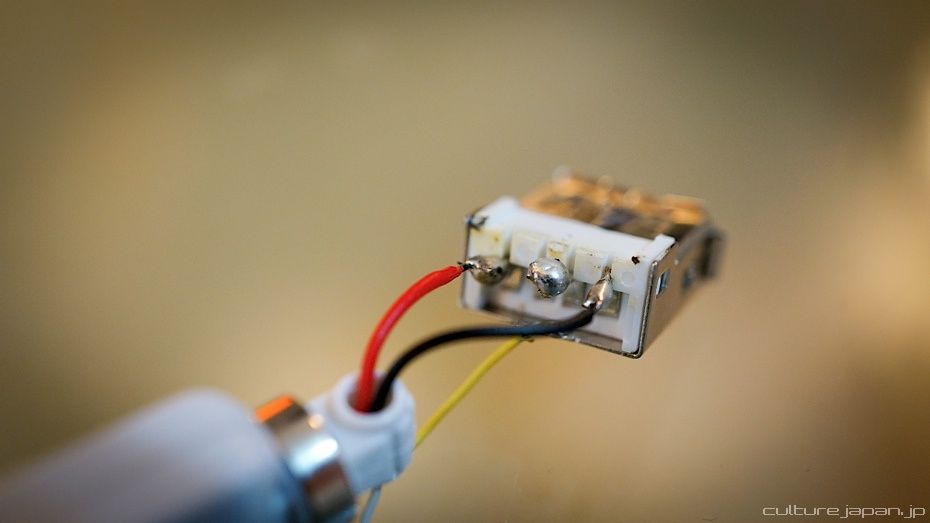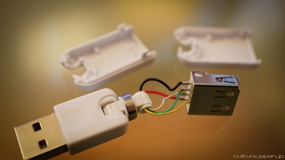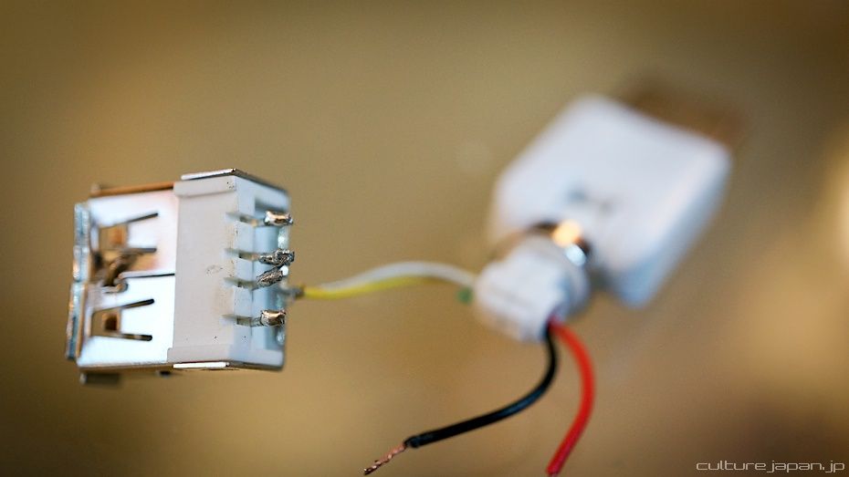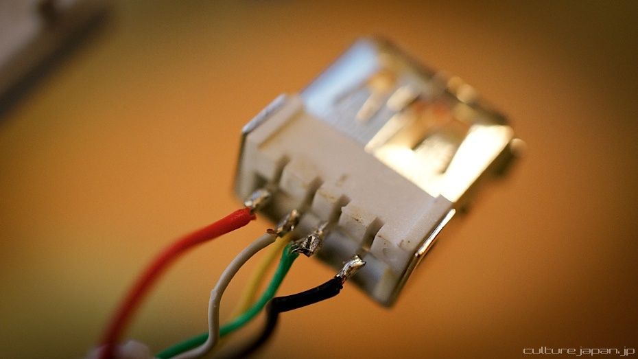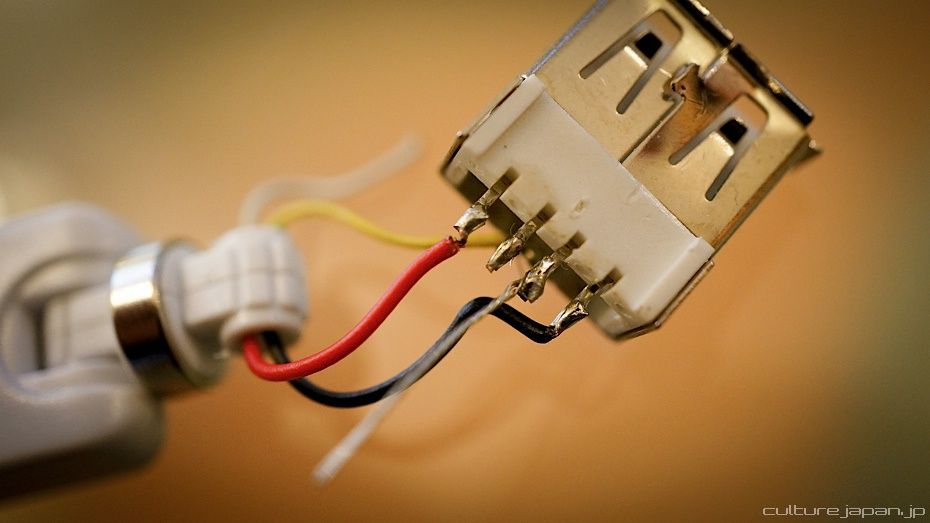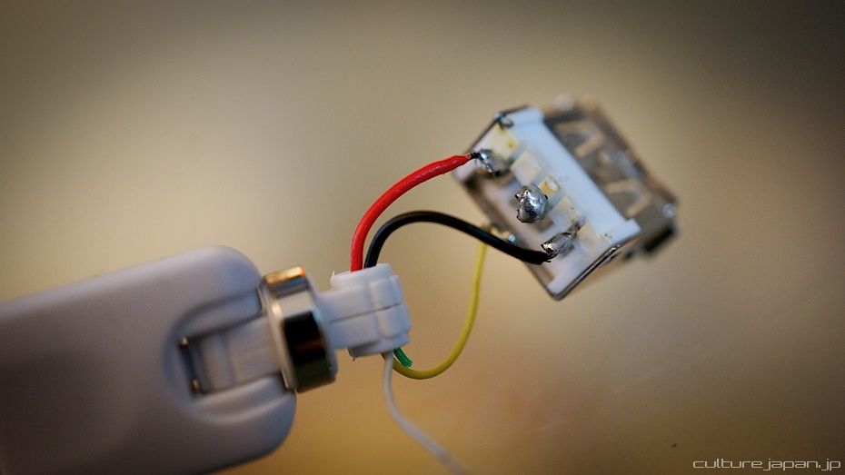 Now you need to whip out that pocket solder. Here I have soldered the red and black wires back onto the USB head. I have also soldered the middle two pins together. Not sure why this works because all I did was