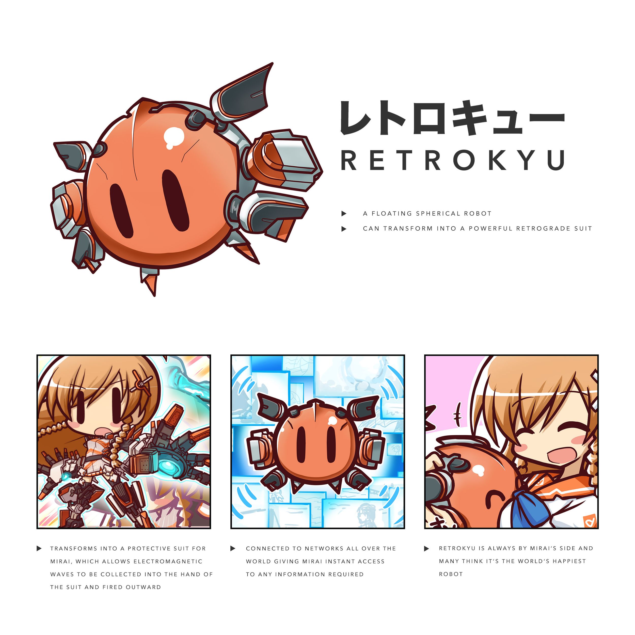 Retrokyu (レトロキュー) is spherical android handed over to Mirai Suenaga from a member of Genesis Frontier. Retrokyu follows Mirai wherever she goes and also transforms into the Retrograde Suit.