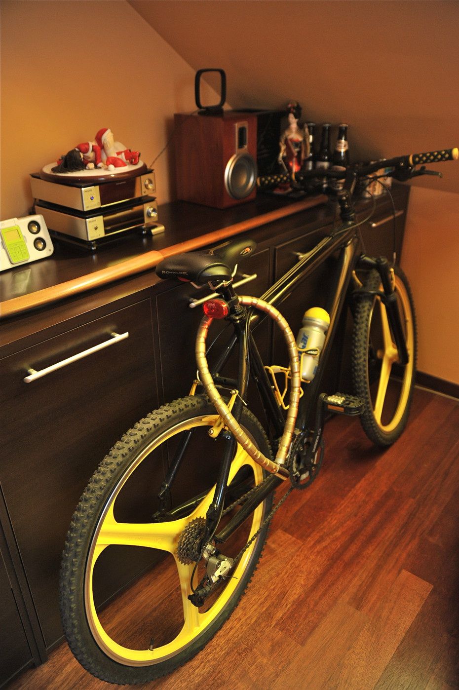 Tigra has a very nice cosy room with slanted roofs. The room is covered in a orange and the wood flooring and furniture adds gives a nice n warm feel.